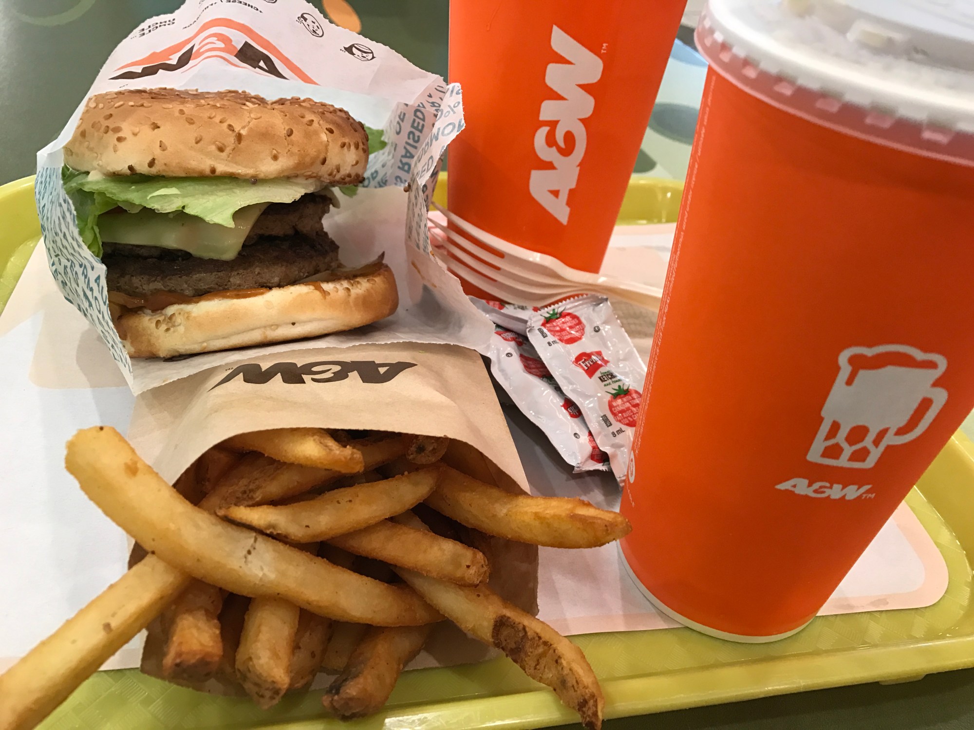 16:34 First meal of the day was A&W, haha, yeah ‘cause we don’t have that in Hong Kong. Had a BBQ sauce teen burger meal with fries and root beer, yum yum!